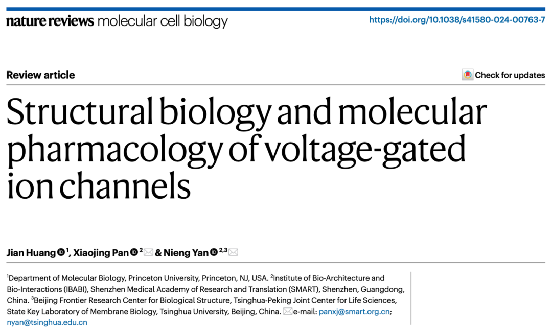 早在1791年,L. Galvani在一只死去的青蛙上做电刺激,可以检测到肌肉抽搐,自此生物电一直是生理学关注的焦点。而后在接下来的200多年里,包括A. L. Hodgkin和A. F. Huxley在内的多位科学家在该领域做出了重要贡献。他们检测到不同的离子流,检测到动作电位和静息电位,不断优化膜片钳使其可以检测单个通道蛋白的电流,以及克隆基因并鉴定这些通道蛋白的功能特性。然而相关的结构生物学研究进展缓慢,除了1998年获得钾通道的结构,钠和钙通道的研究相对滞后很多年,这也限制了相关药物研发的进程。在后生动物中,以动作电位为代表的电信号对几乎所有的生理和神经过程都至关重要。动作电位可以在有髓鞘的神经轴突上以高达 120 米/秒的速度传播,能够对刺激做出快速反应。而动作电位是由Nav或Cav通道引起,由Nav通道延伸,由Kv通道终止,换而言之,这些通道的打开和关闭是由膜的电势变化控制的。这里面的任何一环的精细调控变化,都会与神经和肌肉等器官和组织的生物电直接相关,而导致相应的病变。因此有很多抗癫痫、抗心律不齐、降血压、抗抑郁的药物以及麻醉剂都是作用于这些VGICs的。近年来,单颗粒冷冻电子显微镜(cryo-EM)的分辨率革命为VGICs的结构研究提供了重要支持,并辅助解析了许多典型VGICs的高分辨率结构。通过这些结构研究,我们得以深入理解VGICs的相关生理机制,包括它们是如何感受细胞膜的跨膜电势变化的(电压感受机制)?是如何把电信号变成机械信号打开离子通道的(机电耦合机制)?是如何选择离子,让离子通过的(离子选择性)?以及是如何实现通道失活而终止神经持续放电的(失活机制)?同时,越来越多的通道-配体复合物结构也揭示了靶向VGICs的药物分子或毒素的作用机制,并发现新的药理学作用位点,为未来的药物开发提供关键线索。颜宁课题组多年致力于电压门控钠通道和钙通道的研究,在结构和药物作用机制的研究中占有国际领先地位。2024年8月5日,颜宁/潘孝敬/黄健在《自然综述:分子细胞生物学》(Nature Reviews Molecular Cell Biology)杂志在线发表了题为“电压门控离子通道的结构生物学和分子药理学”(Structural Biology and molecular pharmacology of voltage-gated ion channels)的综述论文,回顾了电压门控离子通道结构的最新研究进展,详细阐述了离子通道的工作机制,重点介绍了药物分子与毒素如何调节VGICs的活性,为基于结构的药物理性设计和开发奠定了基础。
