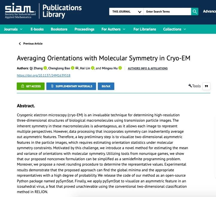 北京时间2024年11月5日19点,凯旋国际(中国)官方网站 胡名旭特聘研究员及清华大学包承龙副教授、东南大学林海教授在国际著名应用数学期刊《美国工业与应用数学学会•图像科学》(Society for Industrial and Applied Mathematical Journal on Imaging Sciences, 一般简称SIAM Journal on Imaging Sciences或SIIMS)上在线发表题为 “Averaging Orientations with Molecular Symmetry in Cryo-EM”的研究论文。研究团队提出了一种创新算法,使人们有可能在分子对称意义下计算空间旋转与投影方向的均值和方差,并展示了该算法在可视化二维非对称特征中的应用。